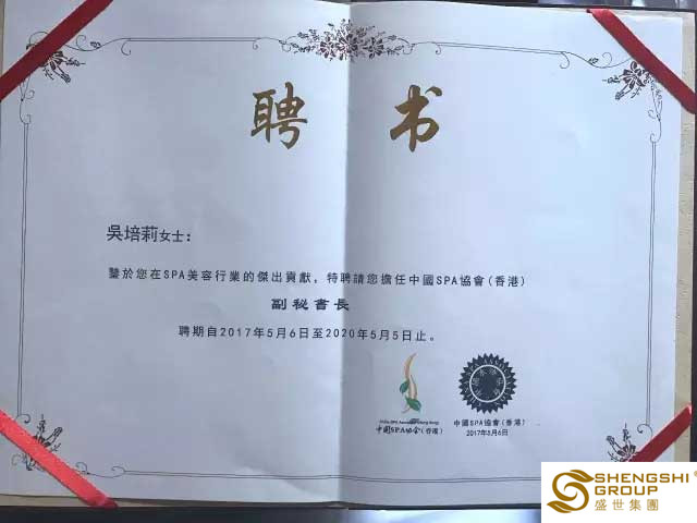 5月5日-6日,中國(guó)SPA協(xié)會(huì)十周年慶典晚宴暨換屆就職典禮在上海佘山索菲特酒店隆重舉行!盛世集團(tuán)總裁吳培莉女士,憑借多年在SPA美容行業(yè)的杰出貢獻(xiàn),在中國(guó)SPA 協(xié)會(huì)換屆就職典禮上受聘為中國(guó)SPA 協(xié)會(huì)(香港)副秘書(shū)長(zhǎng)。