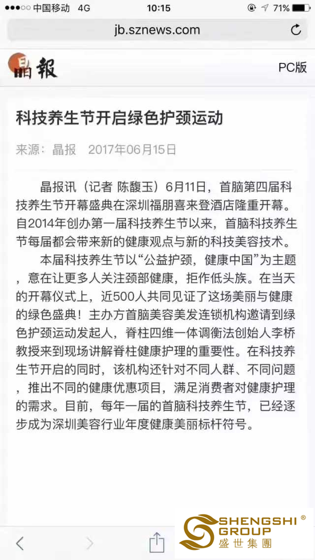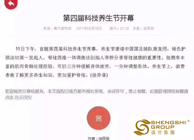 近日,盛世集團【綠色護頸運動】大型公益講座,在全國各地頻頻發(fā)起;就這樣熱火朝天的綠色健康風暴活動,引得深圳南方都市報、深圳晶報、湖南瀟湘晨報、長沙晚報、楚天都市報等各大媒體爭相報道。
